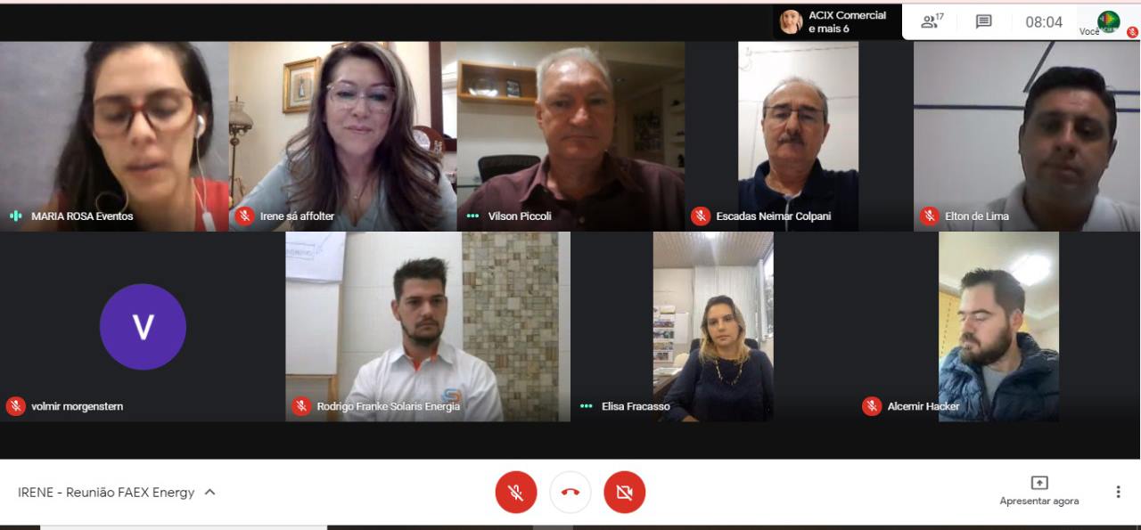 No dia 24, foi realizada a reunião que definiu a comissão organizadora, composta por Irene Sá Affolter, como presidente da feira, Neimar Colpani, vice-presidente e Alcemir Hacker como coordenador geral da FAEX ENERGY. E no dia de hoje, foram tratados assuntos pontuais sobre a organização. Para os próximos encontros serão definidas as subcomissões para a execução das ações para realização da feira.