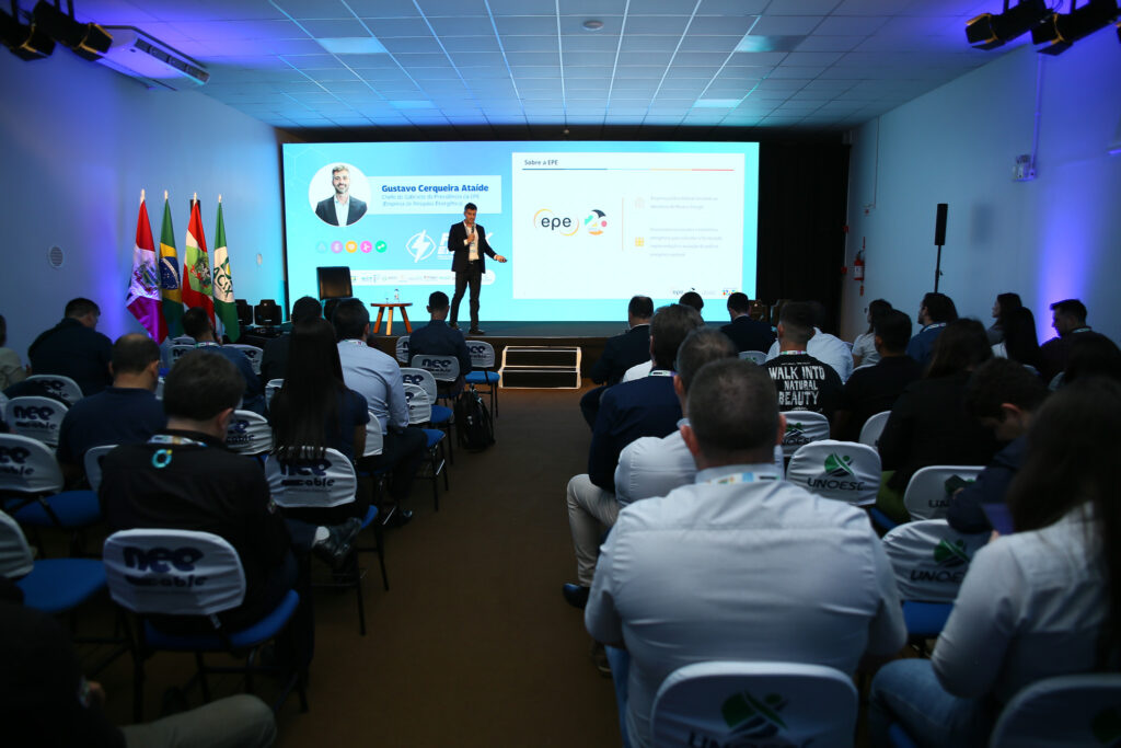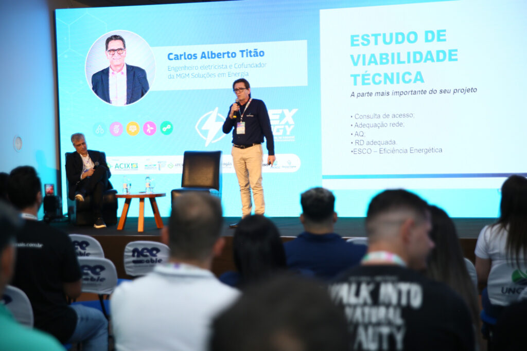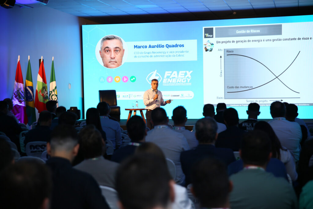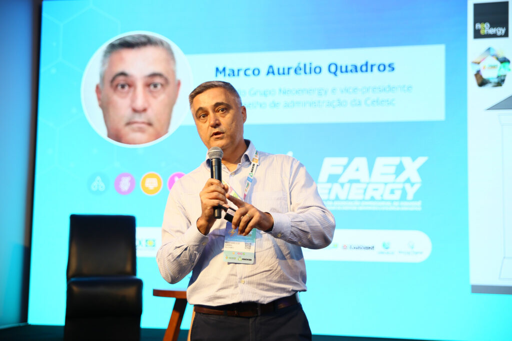 A segunda palestra da tarde foi com Marco Aurélio Quadros, CEO do Grupo Neoenergy e vice-presidente do conselho de administração da Celesc, que trouxe para discussão a Viabilidade de Projetos Hidrelétricos, compartilhando Lições Aprendidas e Perspectivas Futuras para Investidores.